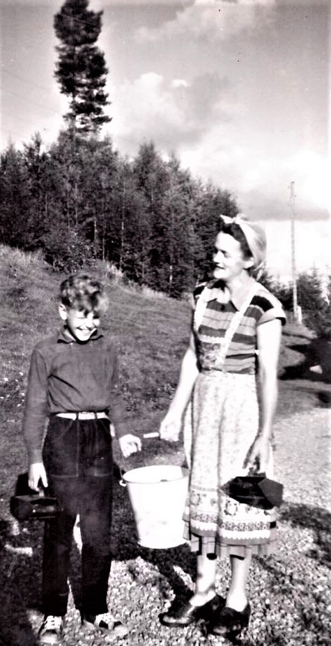 Jag var väl inte överförtjust när det skulle plockas bär under en hel dag, men att gå ut med mamma i skogarna nära hemmet och plocka några timmar kunde vara rätt trevligt. På bilden är jag kanske tio år och vi hade plockat en hink med lingon i skogen nära gården.