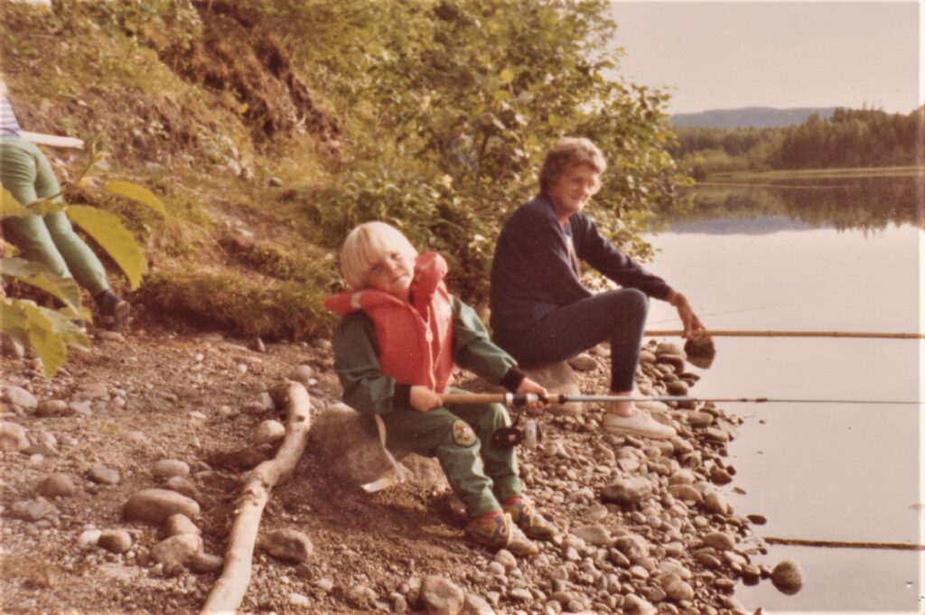 Där Ammerån går in i ett lugnare vatten och rinner ut i Indalsälven kan det se ut som på bilden här nedan. En farmor (min mamma Sigrid) med sitt barnbarn (min son Martin) fiskar och samtalar.